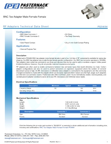 Pasternack’s PE9484 BNC tee adapter male-female-female is part of our full line of RF components available for same-day