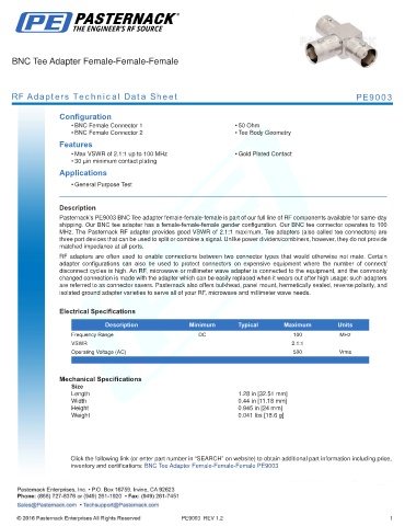 MHz. The Pasternack RF adapter provides good VSWR of 2.1:1 maximum. Tee adapters (also called tee connectors) are