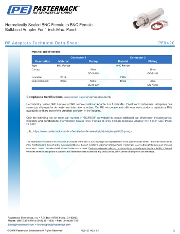 inventory and certifications: Hermetically Sealed BNC Female to BNC Female Bulkhead Adapter For 1 inch Max. Panel