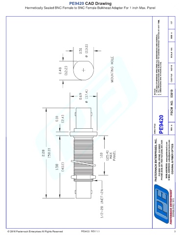 PE9420 CAD Drawing Hermetically Sealed BNC Female to BNC Female Bulkhead Adapter For 1 inch Max. Panel PE9420 REV 1.1 3