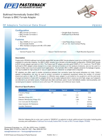 inventory and certifications: Bulkhead Hermetically Sealed BNC Female to BNC Female Adapter PE9093
