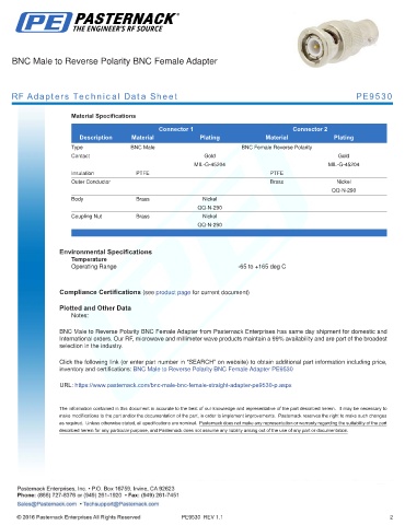 inventory and certifications: BNC Male to Reverse Polarity BNC Female Adapter PE9530