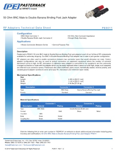 inventory and certifications: 50 Ohm BNC Male to Double Banana Binding Post Jack Adapter PE9011
