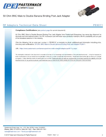 inventory and certifications: 50 Ohm BNC Male to Double Banana Binding Post Jack Adapter PE9011