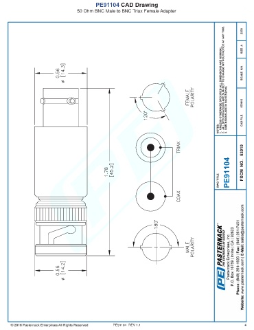 PE91104 CAD Drawing 50 Ohm BNC Male to BNC Triax Female Adapter PE91104 REV 1.1 4