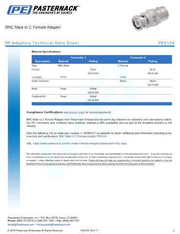 inventory and certifications: BNC Male to C Female Adapter PE9109