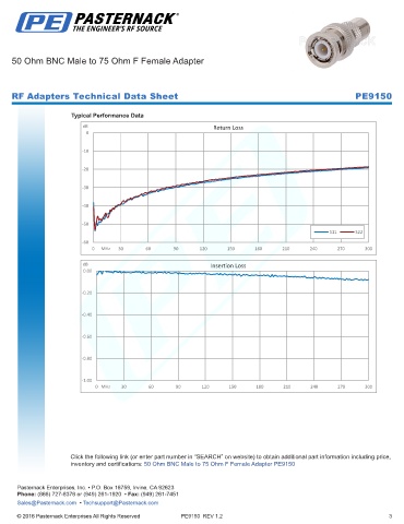 inventory and certifications: 50 Ohm BNC Male to 75 Ohm F Female Adapter PE9150
