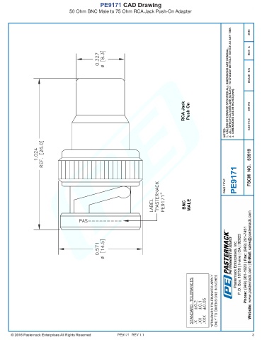 PE9171 CAD Drawing 50 Ohm BNC Male to 75 Ohm RCA Jack Push-On Adapter RCA Jack Push On BNC MALE PE9171 REV 1.1 3