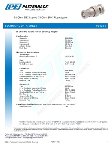 inventory and certifications: 50 Ohm BNC Male to 75 Ohm SMC Plug Adapter PE9234