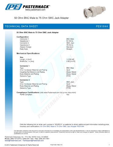 inventory and certifications: 50 Ohm BNC Male to 75 Ohm SMC Jack Adapter PE91044