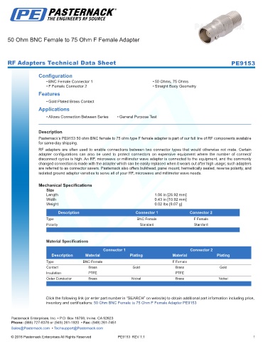 inventory and certifications: 50 Ohm BNC Female to 75 Ohm F Female Adapter PE9153