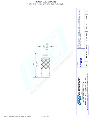 PE9231 CAD Drawing 50 Ohm BNC Female to 75 Ohm SMB Jack Adapter © 2013 Pasternack Enterprises All Rights Reserved PE9231 REV 3