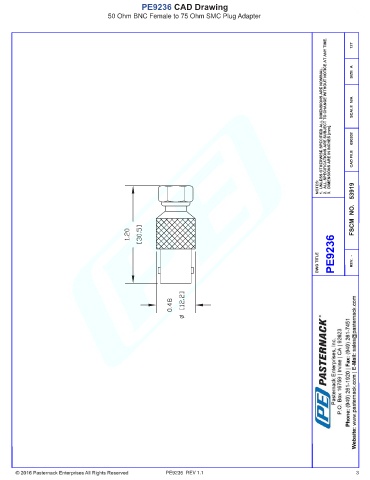 PE9236 CAD Drawing 50 Ohm BNC Female to 75 Ohm SMC Plug Adapter PE9236 REV 1.1 3