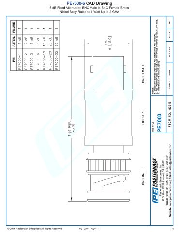 PE7000-6 CAD Drawing 6 dB Fixed Attenuator, BNC Male to BNC Female Brass Nickel Body Rated to 1 Watt Up to 2 GHz PE7000-6 REV 1.1 5
