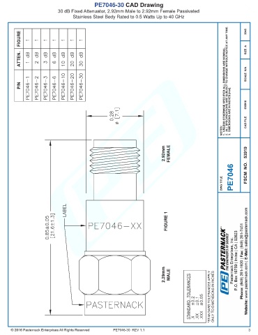 PE7046-30 CAD Drawing 30 dB Fixed Attenuator, 2.92mm Male to 2.92mm Female Passivated Stainless Steel Body Rated to 0.5 Watts Up to 40 GHz PE7046-30 REV 1.1 3
