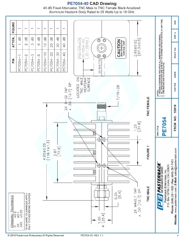 PE7054-40 CAD Drawing 40 dB Fixed Attenuator, TNC Male to TNC Female Black Anodized Aluminum Heatsink Body Rated to 25 Watts Up to 18 GHz PE7054-40 REV 1.1 4