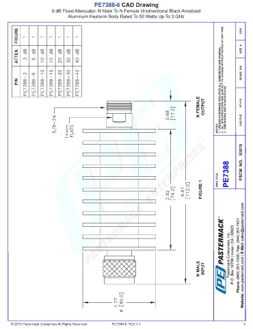 PE7388-6 CAD Drawing 6 dB Fixed Attenuator, N Male To N Female Unidirectional Black Anodized Aluminum Heatsink Body Rated To 50 Watts Up To 3 GHz © 2013 Pasternack Enterprises All Rights Reserved PE7388-6 REV 1.1 3