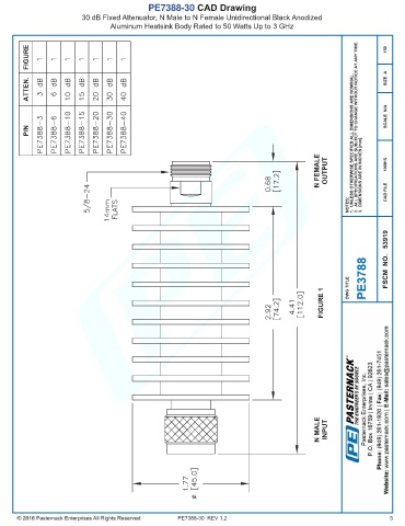 PE7388-30 CAD Drawing 30 dB Fixed Attenuator, N Male to N Female Unidirectional Black Anodized Aluminum Heatsink Body Rated to 50 Watts Up to 3 GHz PE7388-30 REV 1.2 5