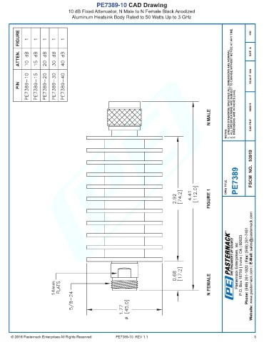 PE7389-10 CAD Drawing 10 dB Fixed Attenuator, N Male to N Female Black Anodized Aluminum Heatsink Body Rated to 50 Watts Up to 3 GHz PE7389-10 REV 1.1 5