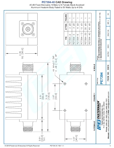 PE7394-40 CAD Drawing 40 dB Fixed Attenuator, N Male to N Female Black Anodized Aluminum Heatsink Body Rated to 50 Watts Up to 4 GHz PE7394-40 REV 1.1 5