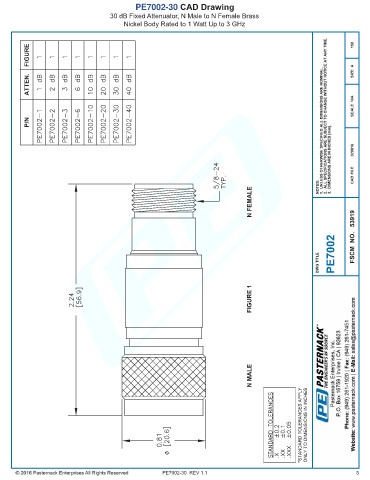 PE7002-30 CAD Drawing 30 dB Fixed Attenuator, N Male to N Female Brass Nickel Body Rated to 1 Watt Up to 3 GHz PE7002-30 REV 1.1 5