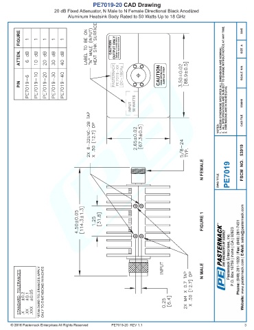 PE7019-20 CAD Drawing 20 dB Fixed Attenuator, N Male to N Female Directional Black Anodized Aluminum Heatsink Body Rated to 50 Watts Up to 18 GHz PE7019-20 REV 1.1 3
