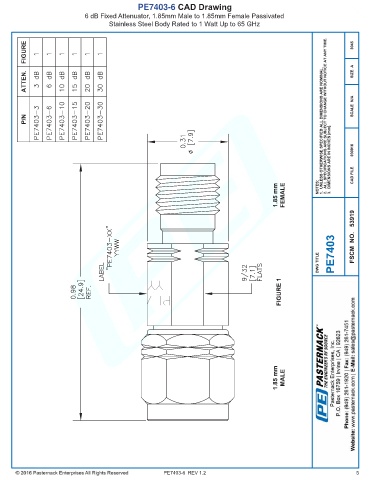 PE7403-6 CAD Drawing 6 dB Fixed Attenuator, 1.85mm Male to 1.85mm Female Passivated Stainless Steel Body Rated to 1 Watt Up to 65 GHz PE7403-6 REV 1.2 5