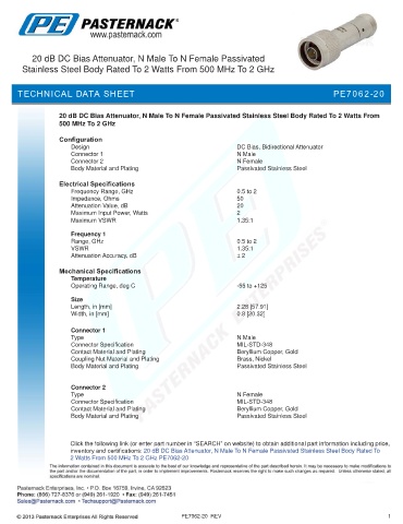 inventory and certifications: 20 dB DC Bias Attenuator, N Male To N Female Passivated Stainless Steel Body Rated To