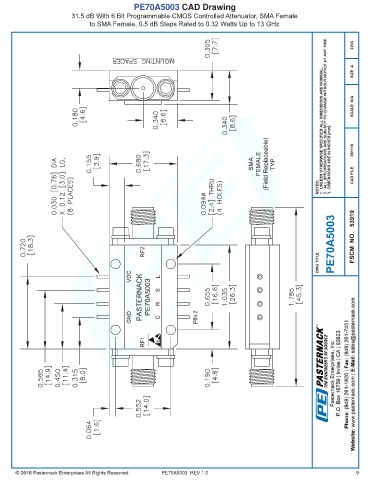 PE70A5003 CAD Drawing 31.5 dB With 6 Bit Programmable CMOS Controlled Attenuator, SMA Female to SMA Female, 0.5 dB Steps Rated to 0.32 Watts Up to 13 GHz PE70A5003 REV 1.0 9