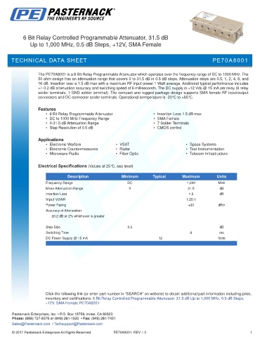 The PE70A8001 is a 6 Bit Relay Programmable Attenuator which operates over the frequency range of DC to 1000 MHz. The