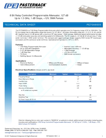 The PE70A8005 is a 7 Bit Relay Programmable Attenuator which operates over the frequency range of DC to 1500 MHz. The