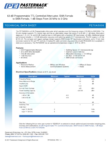 The PE70A5006 is a 6 Bit Programmable Attenuator which operates over the frequency range of 30 MHz to 3000 MHz. The