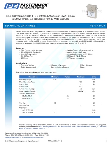 The PE70A5005 is a 7 Bit Programmable Attenuator which operates over the frequency range of 30 MHz to 3000 MHz. The 50