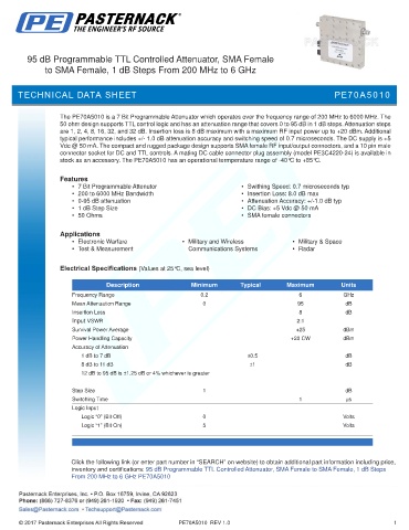typical performance includes +/- 1.0 dB attenuation accuracy and switching speed of 0.7 microseconds. The DC supply is +5