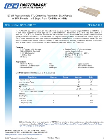 The PE70A5008 is a 7 Bit Programmable Attenuator which operates over the frequency range of 700 MHz to 3000 MHz. The