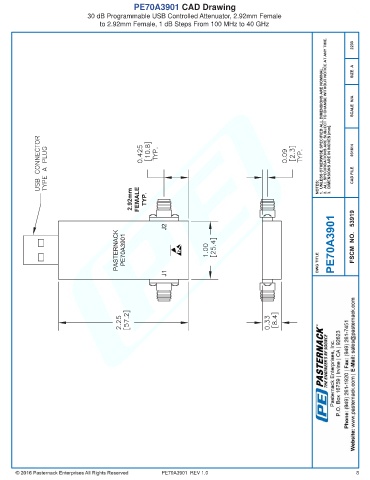 PE70A3901 CAD Drawing 30 dB Programmable USB Controlled Attenuator, 2.92mm Female to 2.92mm Female, 1 dB Steps From 100 MHz to 40 GHz PE70A3901 REV 1.0 8