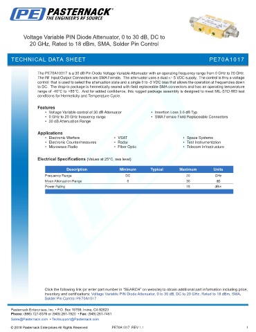 The PE70A10017 is a 30 dB Pin Diode Voltage Variable Attenuator with an operating frequency range from 0 GHz to 20 GHz.