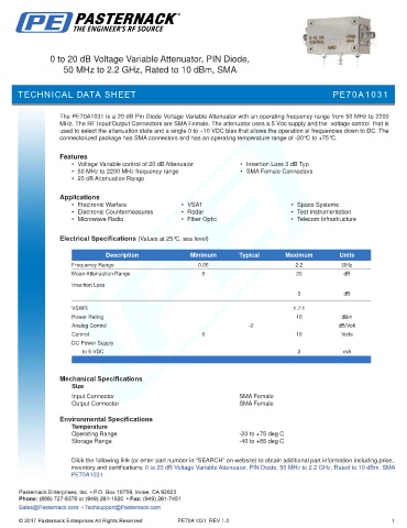 The PE70A1031 is a 20 dB Pin Diode Voltage Variable Attenuator with an operating frequency range from 50 MHz to 2200