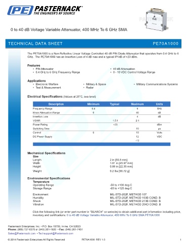 inventory and certifications: 0 to 40 dB Voltage Variable Attenuator, 400 MHz To 6 GHz SMA PE70A1000