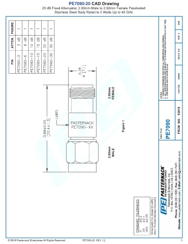 PE7090-20 CAD Drawing 20 dB Fixed Attenuator, 2.92mm Male to 2.92mm Female Passivated Stainless Steel Body Rated to 2 Watts Up to 40 GHz PE7090-20 REV 1.2 3