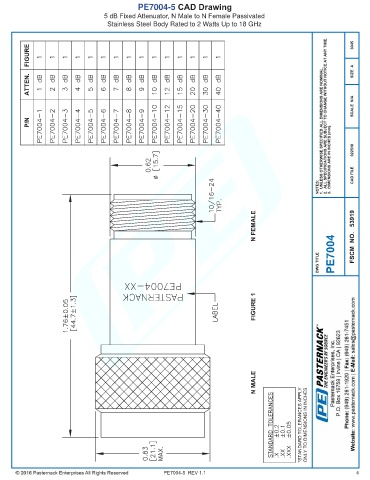PE7004-5 CAD Drawing 5 dB Fixed Attenuator, N Male to N Female Passivated Stainless Steel Body Rated to 2 Watts Up to 18 GHz PE7004-5 REV 1.1 4