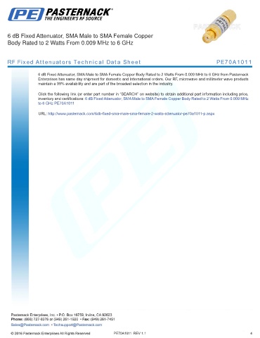 URL: http://www.pasternack.com/6db-fixed-sma-male-sma-female-2-watts-attenuator-pe70a1011-p.aspx
