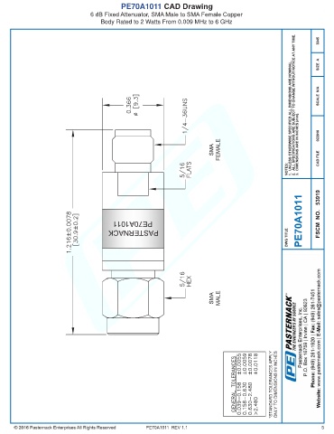 PE70A1011 CAD Drawing 6 dB Fixed Attenuator, SMA Male to SMA Female Copper Body Rated to 2 Watts From 0.009 MHz to 6 GHz PE70A1011 REV 1.1 5