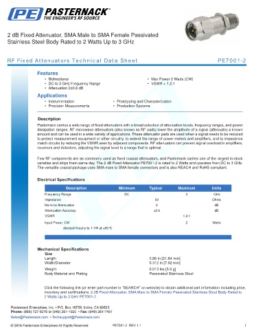 varieties and ships them same day. The 2 dB Fixed Attenuator PE7001-2 is rated to 2 Watts and operates from DC to 3 GHz.