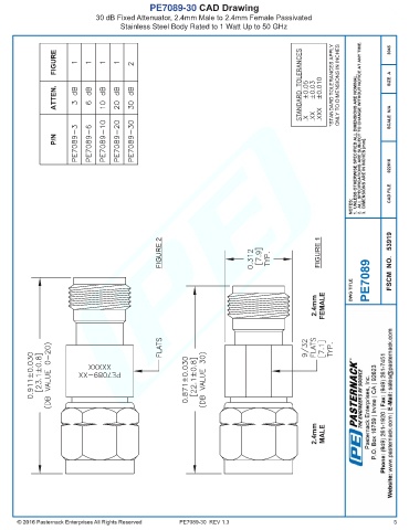 PE7089-30 CAD Drawing 30 dB Fixed Attenuator, 2.4mm Male to 2.4mm Female Passivated Stainless Steel Body Rated to 1 Watt Up to 50 GHz PE7089-30 REV 1.3 5