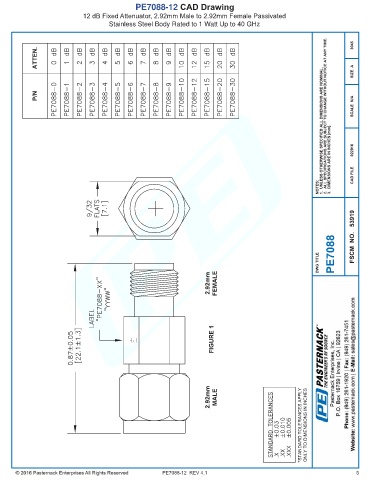 PE7088-12 CAD Drawing 12 dB Fixed Attenuator, 2.92mm Male to 2.92mm Female Passivated Stainless Steel Body Rated to 1 Watt Up to 40 GHz PE7088-12 REV 4.1 5