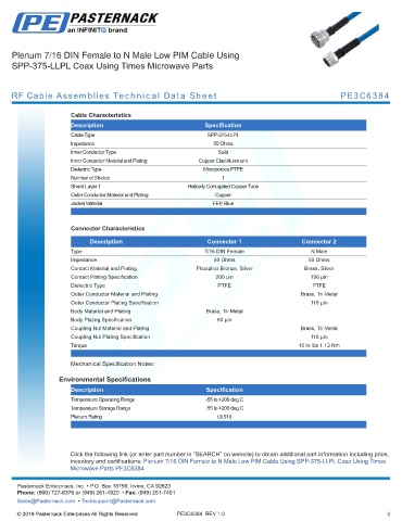 inventory and certifications: Plenum 7/16 DIN Female to N Male Low PIM Cable Using SPP-375-LLPL Coax Using Times