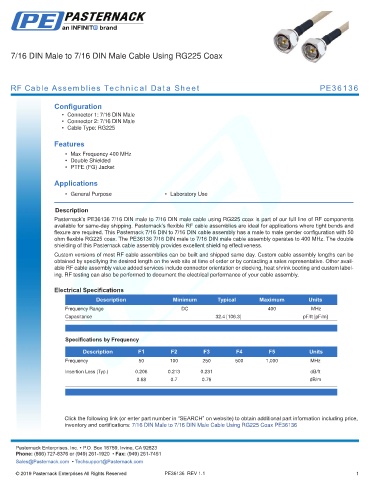 ohm flexible RG225 coax. The PE36136 7/16 DIN male to 7/16 DIN male cable assembly operates to 400 MHz. The double