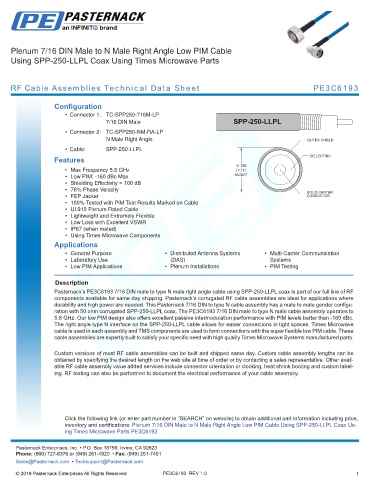 ration with 50 ohm corrugated SPP-250-LLPL coax. The PE3C6193 7/16 DIN male to type N male cable assembly operates to