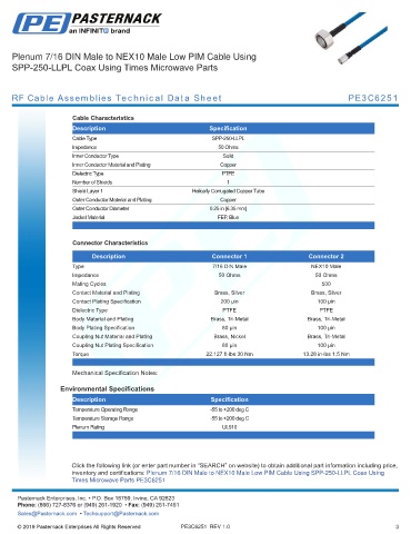 inventory and certifications: Plenum 7/16 DIN Male to NEX10 Male Low PIM Cable Using SPP-250-LLPL Coax Using